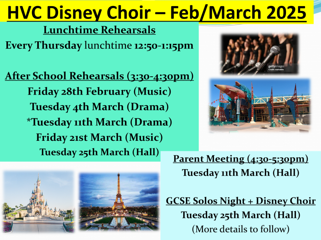 - Tuesday 11 March – Disney Choir Trip meeting for parents and carers (4.30pm)